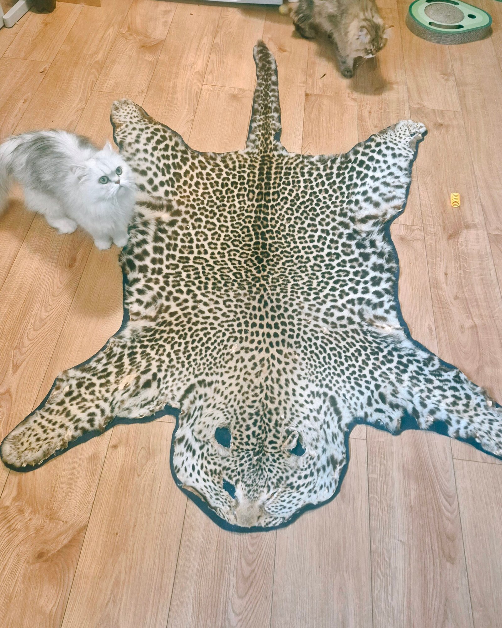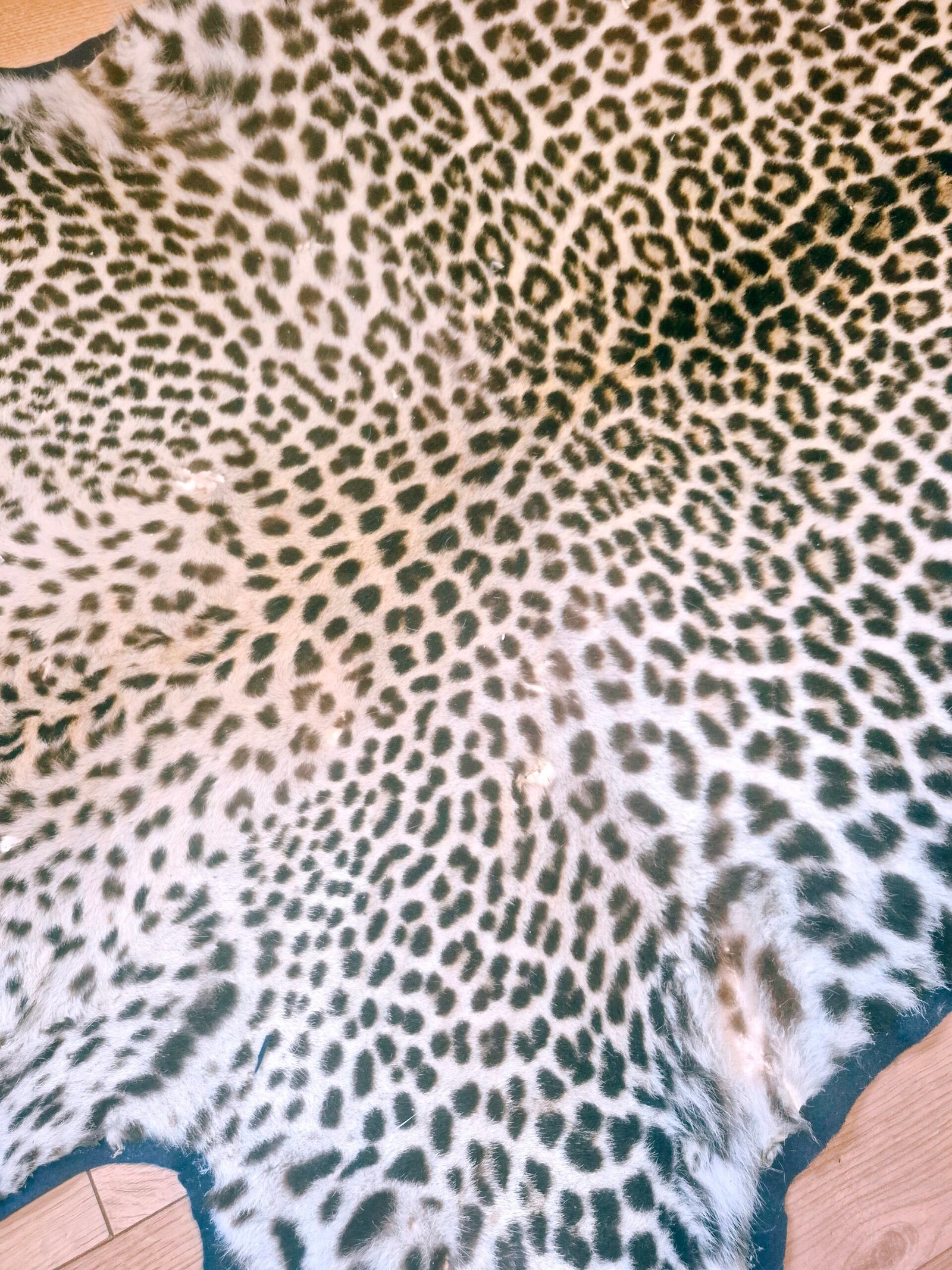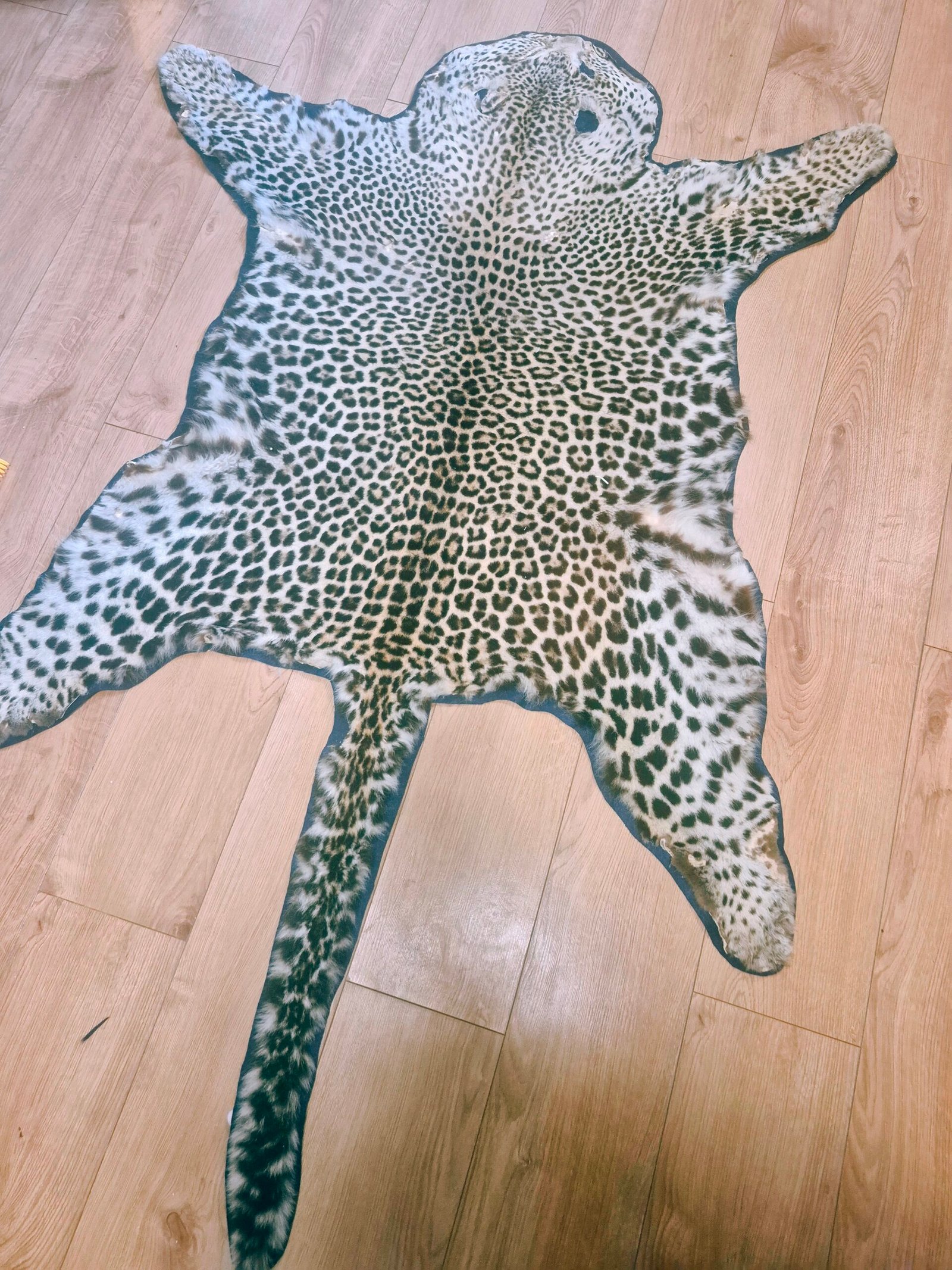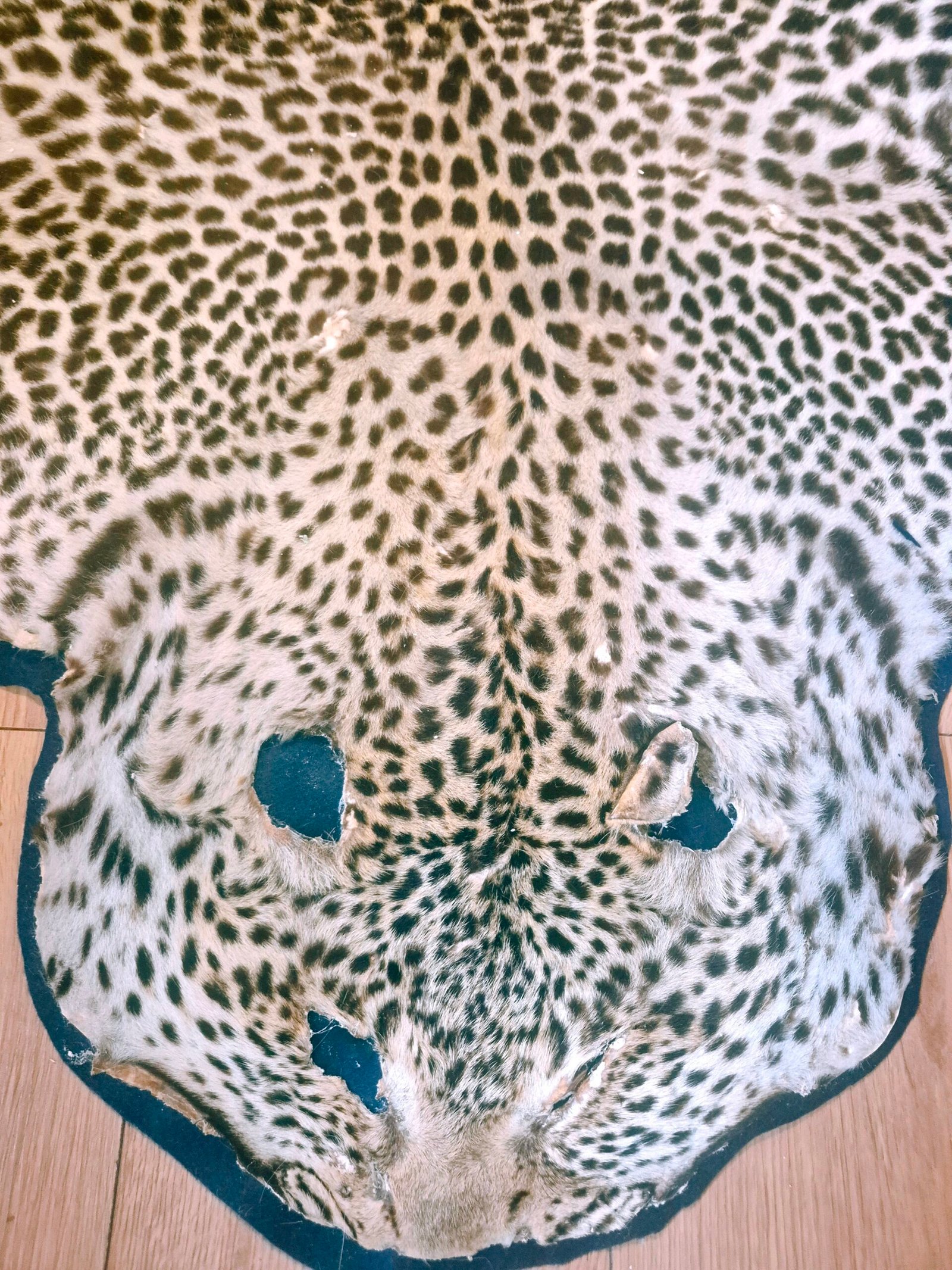 Large, vintage, Leopard skin rug. Due to age, do not expect perfection…however, this is in fantastic condition for it’s age. It has been newly felted and ready to be displayed. Fur has nice patterns and is soft to the touch. Face has damage and ears are long gone.