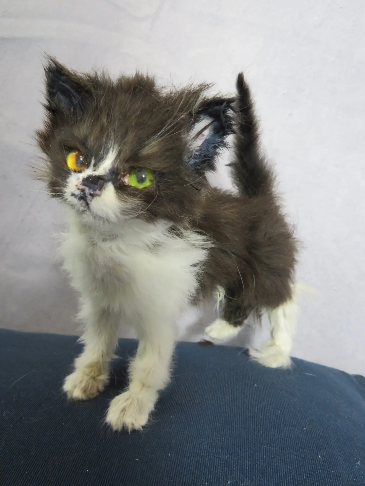Standing kitten mount. Roughly 6 weeks old when passed (natural causes). Please note that this is a very small piece (15cm x 18cm) She’s a little scruffy bless her and has some flaws, however she is such a character! Lovely patches on her nose and sporting one green and one blue eye like her mum. Free standing, cute as a button! Please note, that this kitten passed naturally due to health issues unrelated to her care or owners and has been donated to Folktail to immortalise and pass on to a collector. This item cannot be shipped to the USA due to legal restrictions. No additional licence or paperwork is required for ownership in the UK, EU or Canada.